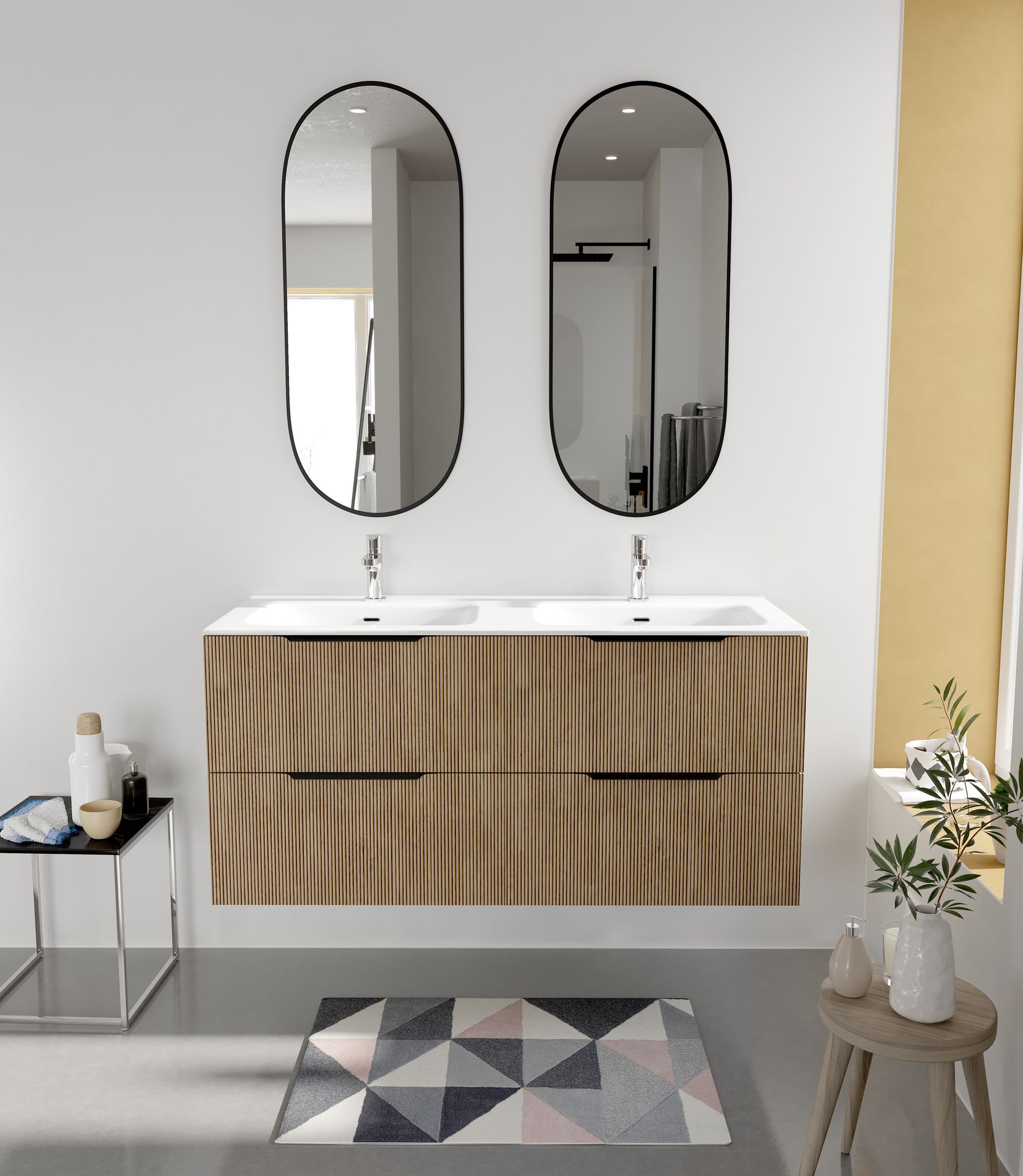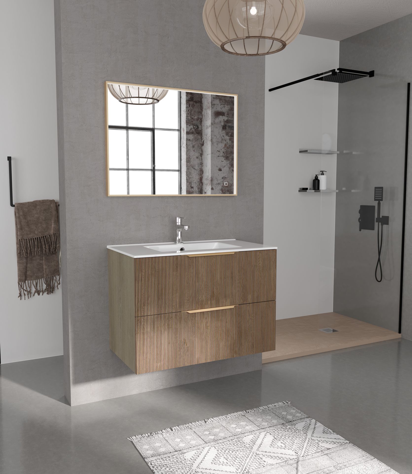 Se trata de un mueble suspendido de dos cajones, con costados ocultos y una estética cuidada hasta el último detalle. Su diseño responde a las tendencias actuales del baño, apostando por líneas limpias, acabados contemporáneos y una combinación de materiales que aporta equilibrio visual y personalidad.