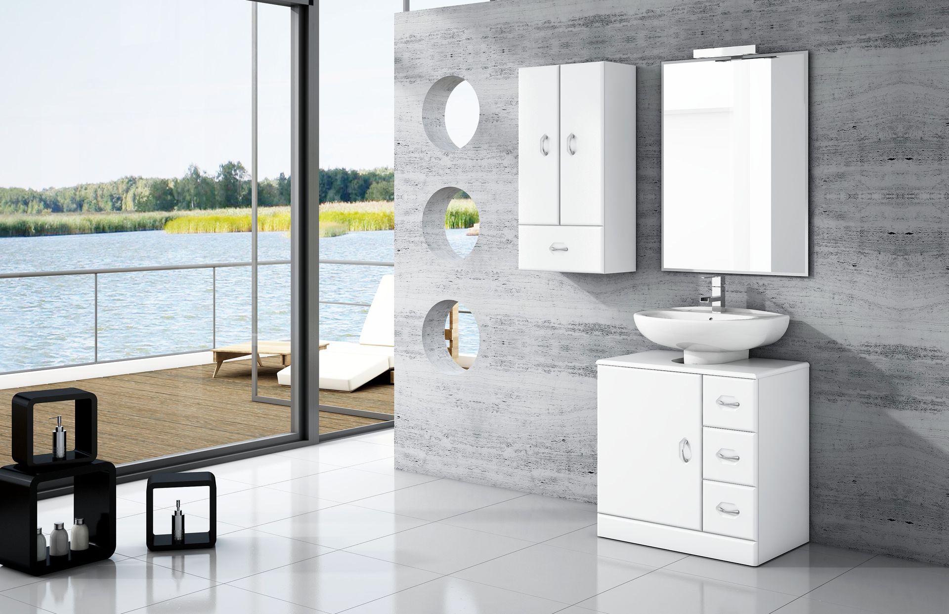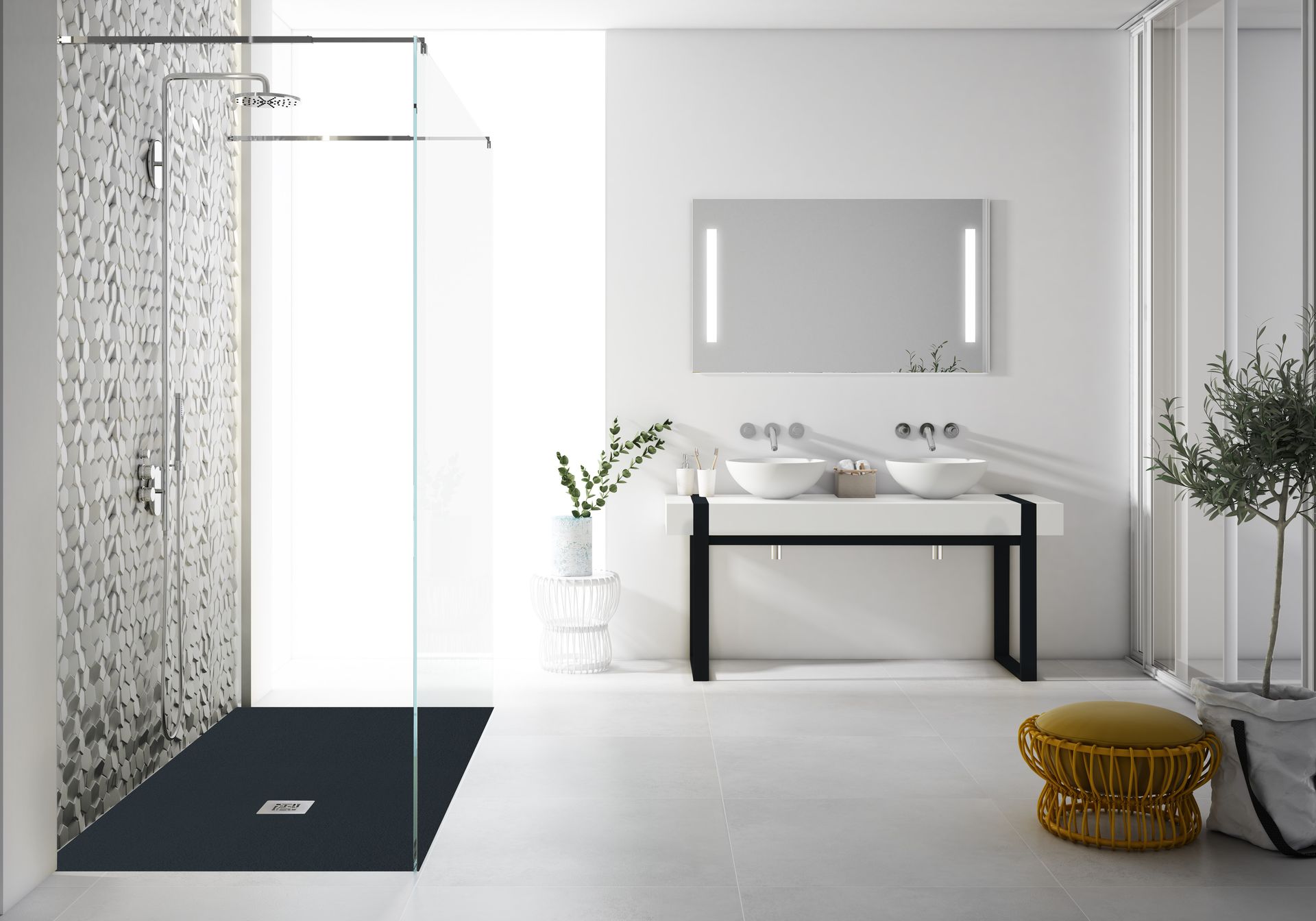 Estilo Moderno: se caracteriza por su estética sencilla, formas limpias y líneas rectas y colores neutros como el blanco, el gris o el negro (utilizando este último solamente para detalles, para no perder la sensación de amplitud). En este estilo las bañeras han quedado totalmente relegadas por los platos de ducha, ya que se busca la practicidad y la comodidad. Mamparas acristaladas, muebles suspendidos y grifería empotrada.