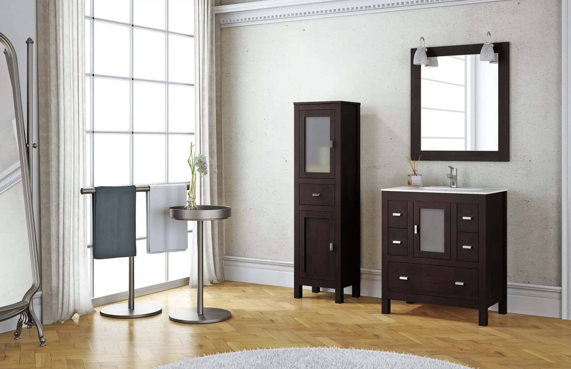 Estilo clásico: El mueble de estilo clásico, nunca pasa de moda, normalmente son de madera maciza y sus líneas y porte son más contundentes. Además, cumplen una doble como un espacio de almacenaje y una pieza decorativa en la estancia. Además, en este estilo, el mármol es la "estrella", usándose sobre todo en encimeras, lavabos o bañeras. Las paredes tienen mucha importancia y están diferenciadas en dos zonas, superior -más clara- e inferior -más oscura-.