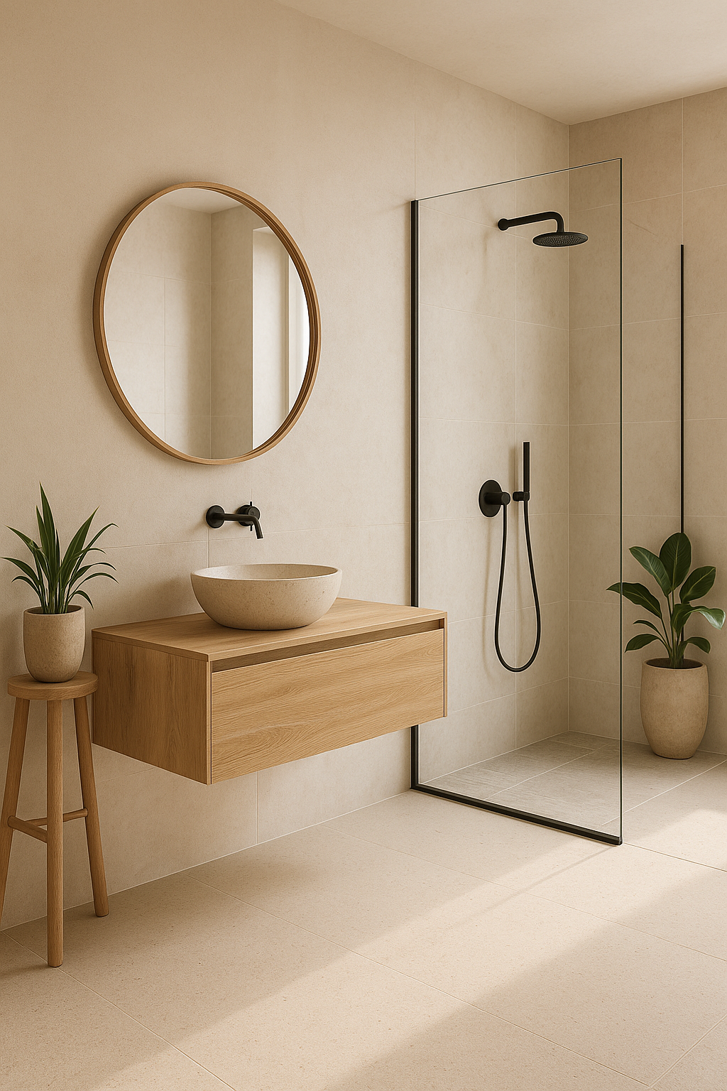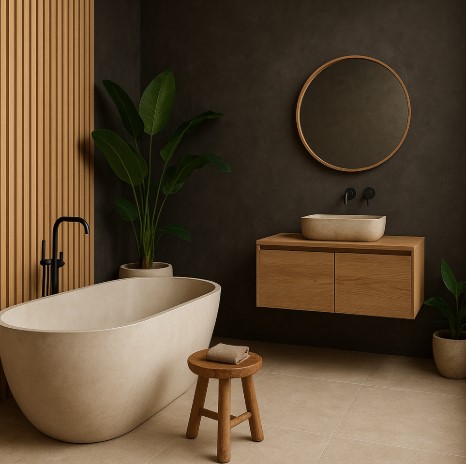 - Complementos: introduce toallas de lino en tonos crudos, jarrones cerámicos de forma orgánica y pequeñas plantas (bambú, palmas enanas) para un aire fresco.